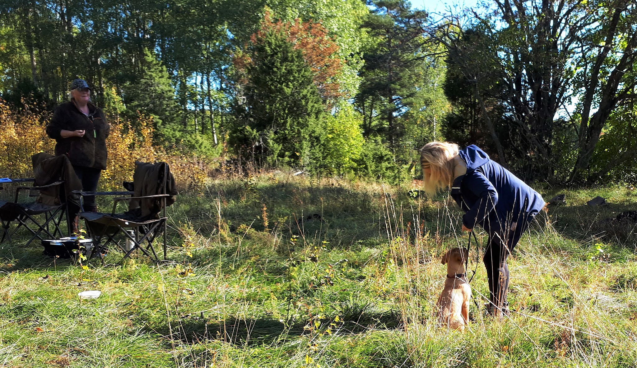 | Efter kontaktövningar, linförighets träning och inkallnings övningar var det dags för viltspårsträning. Nora i startgroparna med husse och matte. |